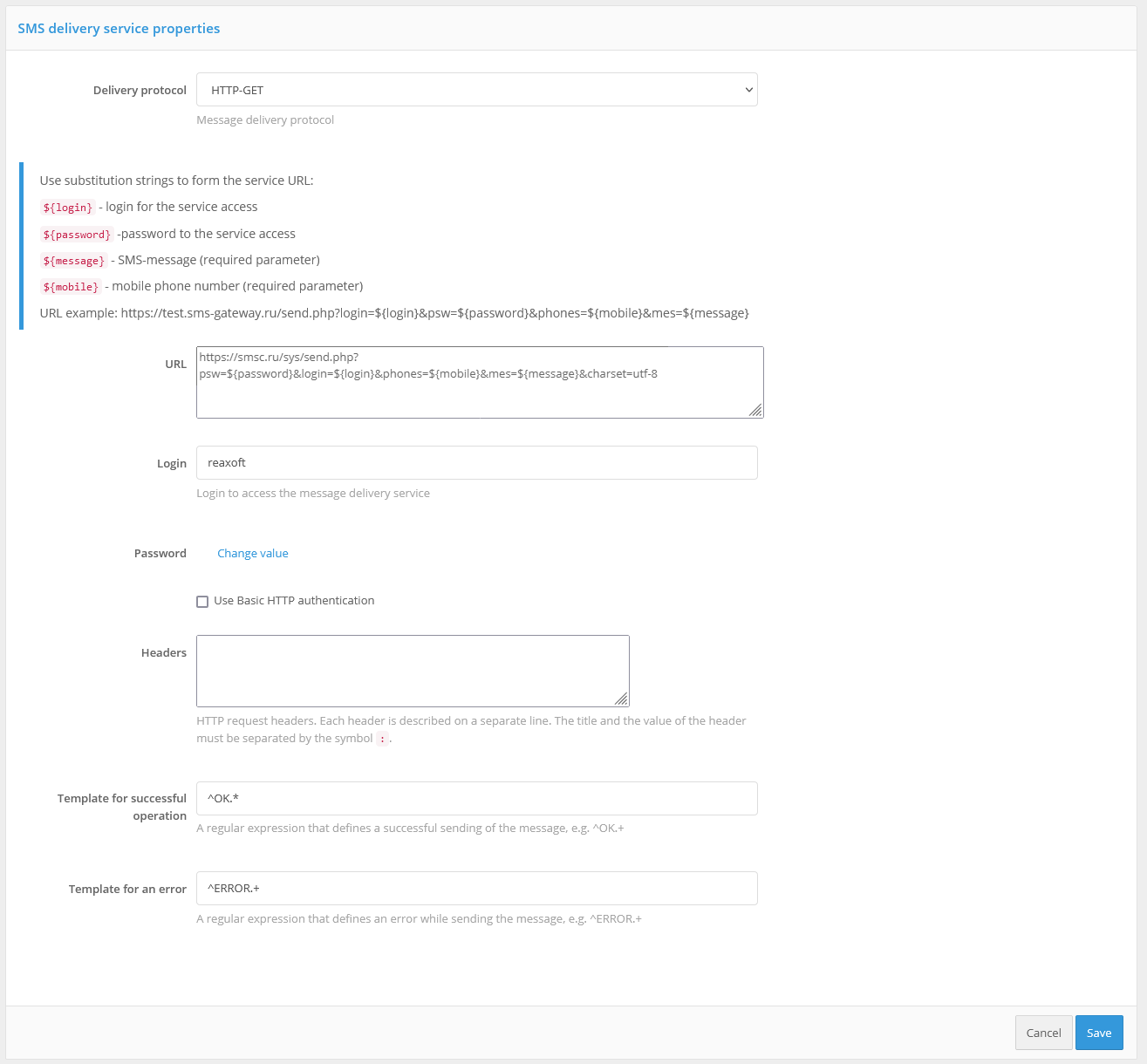SMS gateway URL - set in the form of a pattern to form a request to the SMS gateway to initiate sending of SMS by it. Example of setting for SMS gateway:
