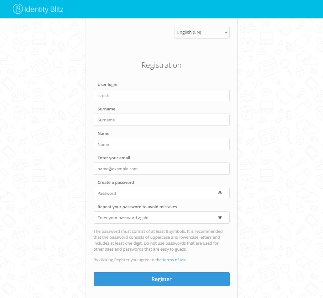 https://{hostname}/blitz/profile.Web application “User registration”. If enabled, you can switch from the login page to the self-registration form (link “Don’t have an account? Register”).
